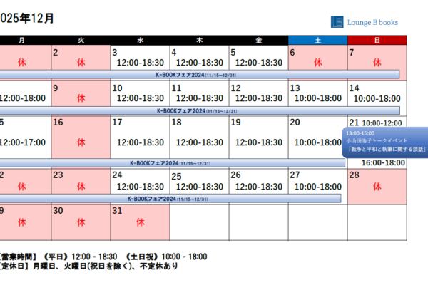K-BOOKフェア2025に参加します。https://lounge-b-books.com/brand/fair-k-book-fair-025/11/22(土)、23(日)に東京・神保町で開催されるK-BOOKフェスティバルの連動企画です。フェスティバルに参加する出版社がその年のテーマに合わせて選んだ一冊を展開します。今年のテーマは「まじわる 우리 모두 다 같이 ―まじわることが希望になる時代に― 」みなさまにとっての「まじわる」一冊をぜひ手にとってみてください。Lounge B booksでは11/15(土)~12月最終営業日までフェア展開します。K-BOOKSフェスティバル公式ウェブサイトhttps://k-bookfes.com/…