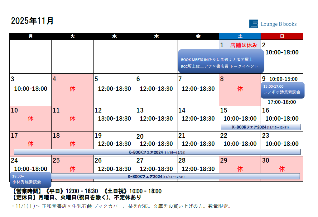 2025年11月の営業カレンダーです。